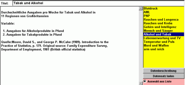 Um einen anderen Datensatz zu laden, muss man die Leiste "Datenauswahl" anklicken, den Datensatz "Alkohol und Tabak" markieren, die Option "Auswahl aus Liste" aktivieren und abschließend die Leiste "Datensatz laden" anklicken.