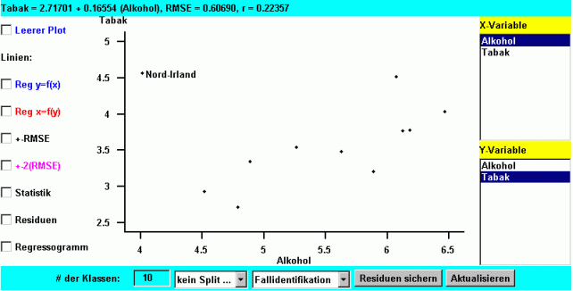 Im Scatterplot Alkohol vs. Tabak kann man durch Anklicken den Ausreißer "Nordirland" identifizieren, wo im Durchschnitt viel Geld für Tabak und wenig Geld für Alkohol ausgegeben wird.