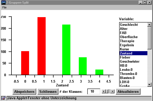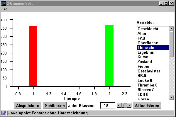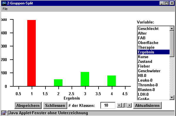 kann mit einem 2-Gruppen-Split der Datensatz bezüglich eines Merkmals in zwei Teile eingeteilt werden. Dazu erscheint in einem separaten Fenster folgendes Bild.