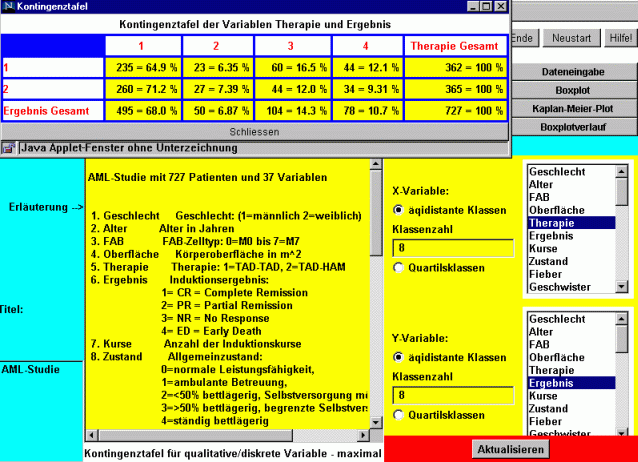 Es wird dann der gewünschte Datensatz mit 727 Patienten und 36 Variablen geladen und steht zur weiteren Analyse mit Hilfe des Applets zur Verfügung.