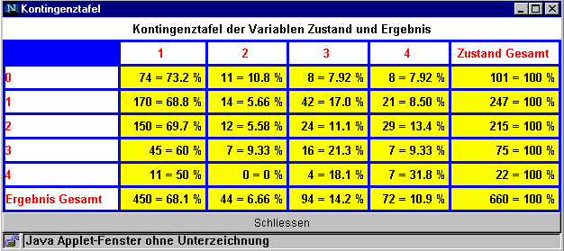 Aus der Kontingenztafel Zustand vs. Ergebnis wird deutlich, dass Patienten mit schlechtem Allgemeinzustand auch eine deutlich schlechtere Prognose haben.