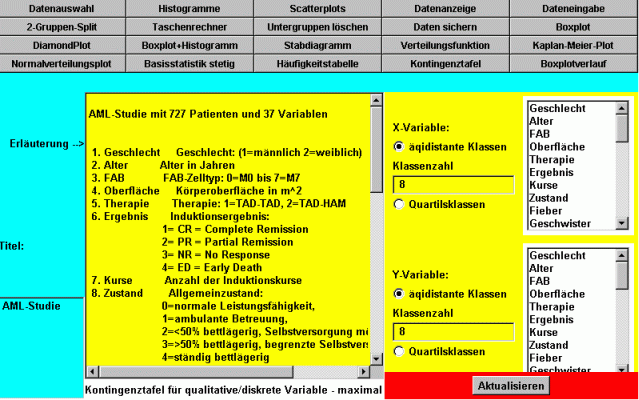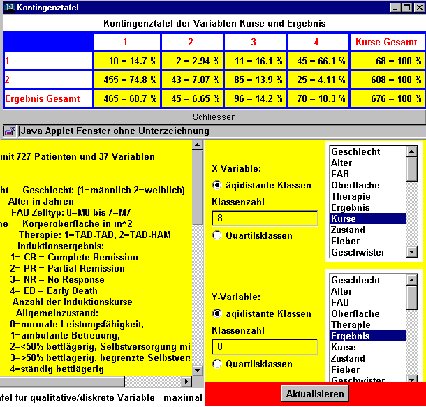 Es wird dann der gewünschte Datensatz mit 727 Patienten und 36 Variablen geladen und steht zur weiteren Analyse mit Hilfe des Applets zur Verfügung.
