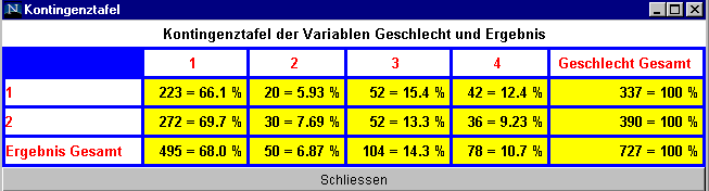 Zur Beantwortung der ersten Frage nach der Unabhängigkeit der Ereignisse A und B wird die Kontingenztafel Geschlecht vs. Ergebnis berechnet.