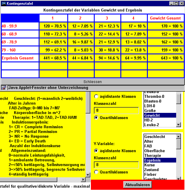 Zur Beantwortung der nächsten Frage werden die Variablen Gewicht mit der Option "Quartilsklassen" und Ergebnis ausgewählt.