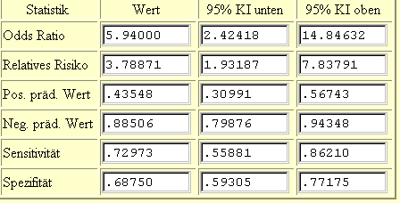 Nach Ankicken der Taste "Berechnen" erhält man folgendes Ergebnis für die gesuchten Werte Sensitivität, Spezifität, positiver und negativer prädiktiver Wert.