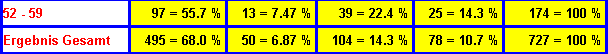 Die gewünschte bedingte Wahrscheinlichkeit P(Ergebnis =CR | Alter >= 52) ist dann 97/174=0.5575.