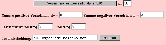 Nach Anklicken der Leiste "Vorzeichen-Test zweiseitig alpha=0.05" wird der Test durchgeführt und das Ergebnis angezeigt.