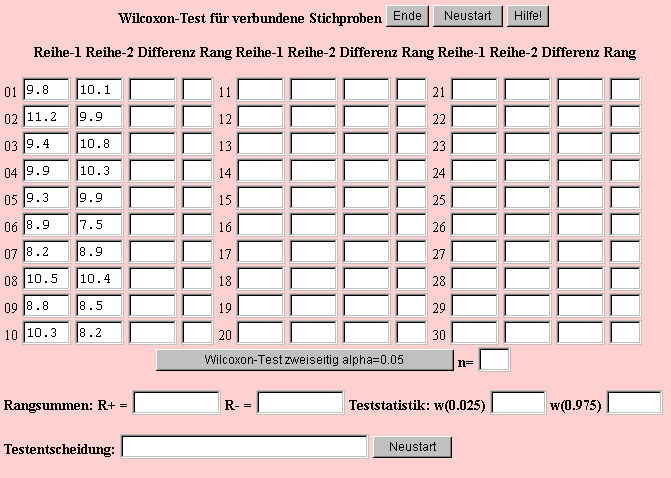 Nach Aufruf der Javascript-Prozedur "Wilcoxon-Test für verbundene Stichproben" erscheint fogendes Bild.