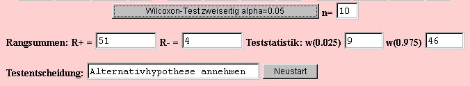 Nach Anklicken der Leiste "Wilcoxon-Test zweiseitig alpha=0.05" wird der Test durchgeführt und das Ergebnis angezeigt.