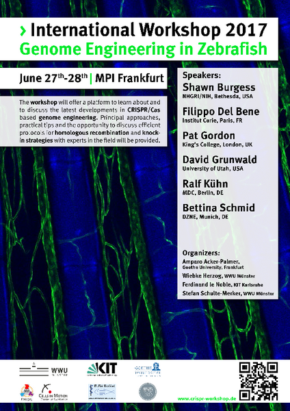 The International Workshop 2017 "Genome Engineering in Zebrafish" took place on June 27th-28th at the MPI Frankfurt.The workshop aimed to discuss the latest developments in CRISPR/Cas based genome engineering with the focus on approaches allowing efficient genome editing in zebrafish. The goal was to discuss homologous recombination approaches and knock-in strategies, and was attended by active researchers who already have experience in generating knock-out alleles using TALEN and Crispr approaches. Special attention has been paid to practical tips and efficient protocols, and there have been many opportunities provided for small group discussions with experts in the field.