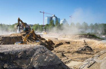 Münster (mfm/tb) - Rund einen Kilometer misst der Bauzaun. In dem Areal, das er einschließt, werden im Schnitt täglich 500 Kubikmeter Boden ausgekoffert, in der Summe werden es 90.000 sein. „Am Coesfelder Kreuz läuft tatsächlich die größte Baustelle der Stadt Münster, als die wir sie auch angekündigt haben“, freut sich Prof. Frank Ulrich Müller, Dekan der Medizinischen Fakultät der Universität Münster. Zu dem, was das riesige Loch auf dem früheren Parkplatz in einigen Jahren füllen wird, hat er eine Info-Veranstaltung initiiert. „Wir laden alle Anwohner herzlich ein, sich selbst ein Bild zu machen zu den Planungen“.