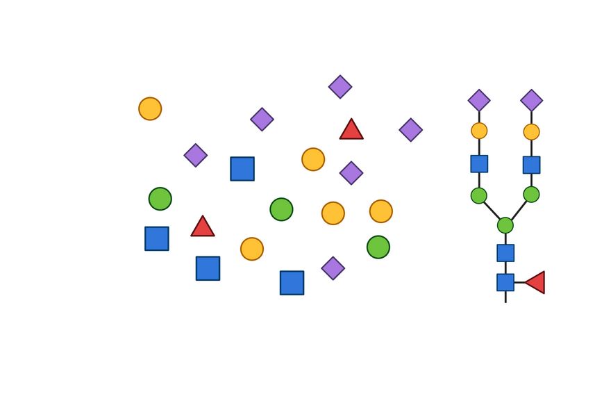 Schematische Darstellung eines Glykans und mehrere Einfachzucker. Created with biorender.com Congenital Disorders of Glycosylation (CDG) sind seltene, erbliche Stoffwechselerkrankungen, die durch Defekte in der Glykosylierung von Proteinen und Lipiden gekennzeichnet sind. Diese multisystemischen Erkrankungen können sich durch Entwicklungsverzögerungen, neurologische Auffälligkeiten und Funktionsstörungen verschiedener Organe manifestieren.