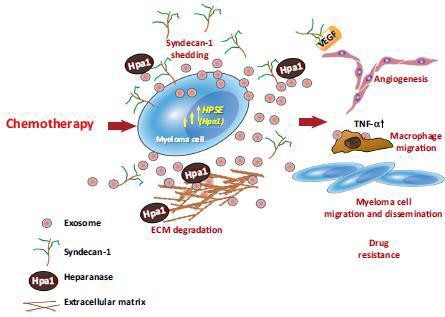 Fig.1. HPSE-carrying exosomes released following chemotherapy facilitate tumor progression10.Treatment of myeloma cells with bortezomib causes a burst of exosome secretion. These exosomes (referred to as chemoexosomes) carry an abundance of HPSE (Hpa) bound to the HS of syndecan-1 present on the exosome surface. Chemoexosomes can transfer HPSE to other tumor cells, thereby enhancing their chemoresistance. HPSE also stimulates syndecan-1 shedding by those cells, facilitating tumor metastasis and angiogenesis. Chemoexosomes may also have VEGF bound on their surface that aids in driving angiogenesis. They also dock with macrophages, stimulating their migration and enhancing their expression of TNF-a. HPSE present on the exosome surface is also available to degrade HS within the ECM, which may liberate tumor-supporting growth factors and facilitate tumor and host cell migration.