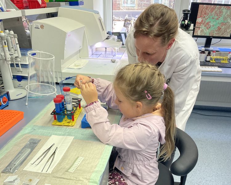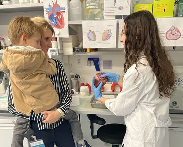 An verschiedenen Stationen zeigten wir unter anderem die histologische Untersuchung von Herzgewebe und gaben Einblicke in die Welt der Zellkulturen. Dabei durften sich kleine und auch große Besucher:innen auch mal selbst am Pipettieren versuchen. Das Highlight des Abends: Unsere Medizindoktorandin Emily Bloehs erklärte anschaulich die Anatomie und Funktion des Herzens – anhand echter Schweineherzen!
