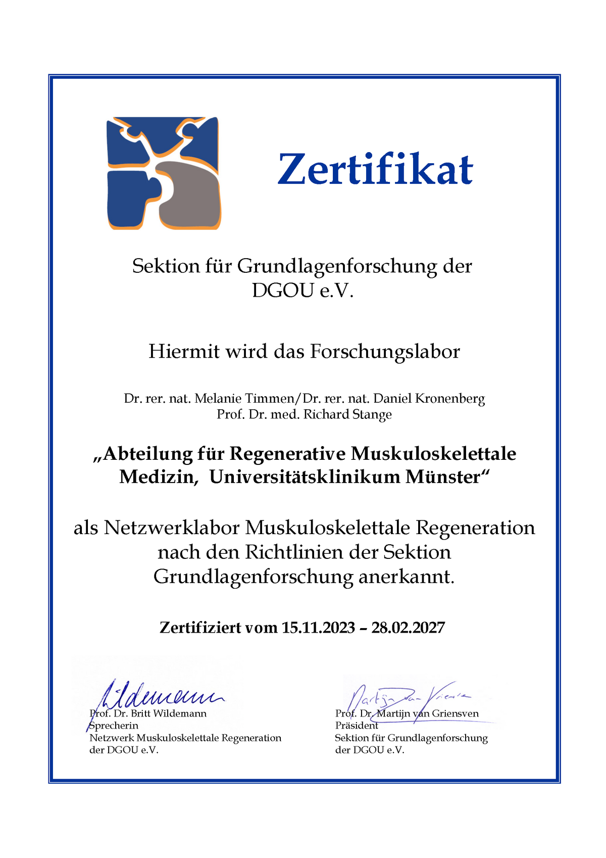 Wank I, Niedermair T, Kronenberg D, Stange R, Brochhausen C, Hess A, Grässel S (2022) Influence of the Peripheral Nervous System on Murine Osteoporotic Fracture Healing and Fracture-Induced Hyperalgesia.. Int J Mol Sci. 2022 Dec 28;24(1):510. doi: 10.3390/ijms24010510.