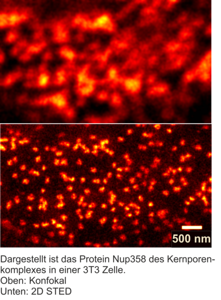 Wir verfügen über ein STEDYCON der Firma Abberior Instruments GmbH (http://www.abberior-instruments.com/products/compact-line/). Dabei handelt es sich um einen Aufsatz, den man auf ein vorhandenes Mikroskopstativ schrauben kann. Das Mikroskop wird damit ein zweidimensionales STED-Mikroskop und zudem ein konfokales Mikroskop. Die Auflösung liegt im STED-Modus bei unter 40nm in x- und y-Richtung. Entlang der z-Achse erzielt das Mikroskop konfokale Auflösung, also etwa 500 nm.