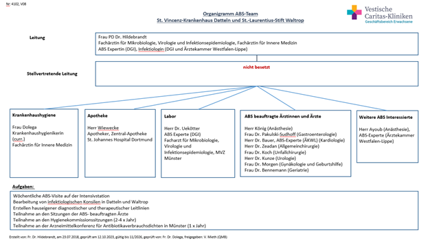 Die zunehmende Resistenz gegen Antibiotika, sowie der Umgang mit Problemkeimen ist ein Thema, das zunehmende Bedeutung erlangt und für uns von besonderer Wichtigkeit ist. Um Resistenzen zu vermeiden und einem überproportionalen Einsatz von Antibiotika entgegen zu wirken, haben wir ein im gesamten Haus tätiges Antibiotic Stewardship (ABS)-Team installiert. Diesem Team gehören neben Frau Dr. med. Hildebrandt Vertreter der Krankenhaushygiene, der Apotheke, des Labors und aller im Haus tätigen Fachrichtungen an. Ziel der ABS-Tätigkeit im Haus ist eine fachübergreifende Evaluation und kontinuierliche Verbesserung der antiinfektiven Diagnostik und Therapie.