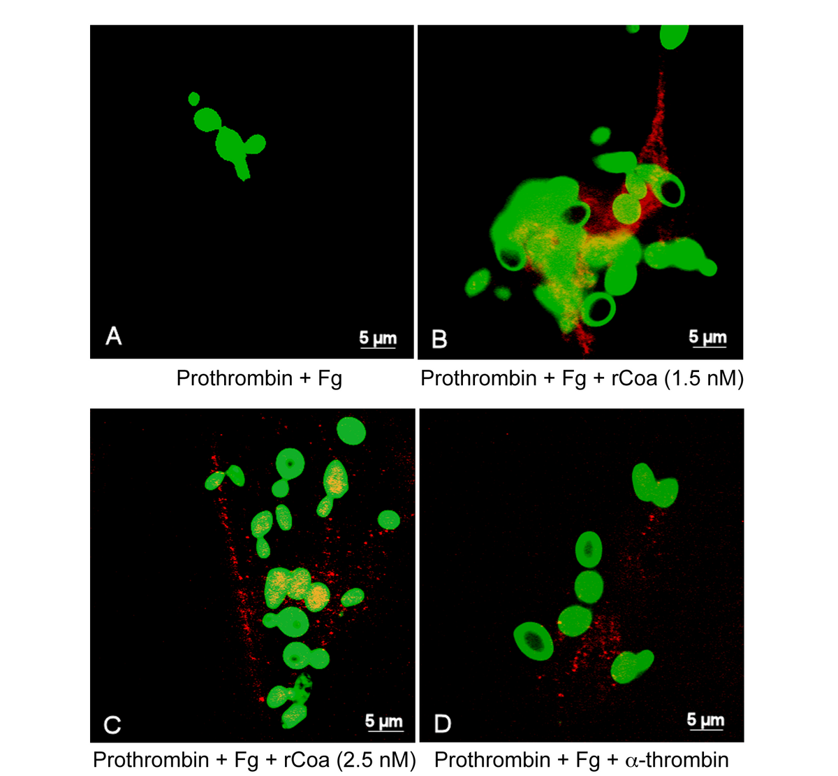 In this project, we identified domains of the S. aureus extracellular fibrinogen-binding proteins coagulase and Efb binding to Candida biofilms. The coagulase leads to the conversion of fibrinogen to fibrin, which may shield the Candida cells against the host immune defense as suggested by CLSM (see Figure C). Indeed, phagocytosis assays demonstrated a reduced phagocytosis rate of Candida in the presence of coagulase or Efb. The inhibition of phagocytosis of Candida cells by coagulase and Efb via two distinct mechanisms suggests that S. aureus might be beneficial for Candida to persist as it helps Candida to circumvent the host immune system.