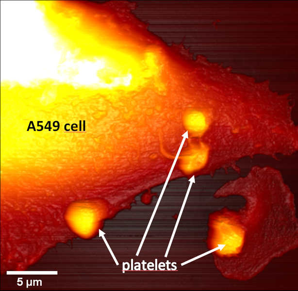 We use different techniques to investigate the interaction of human non-small lung cancer cells (A549) with freshly isolated human platelets.