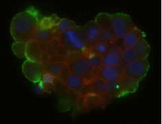 Figure: NHE1 expression (green) in a spheroid of MCF7 cells.