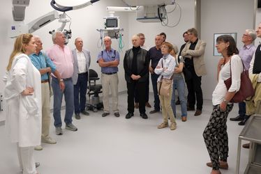 Münster (mfm/ps) - Äußerlich hat sich das Gebäude der Augenklinik an der Domagkstraße 15 seit über neun Jahrzehnten nicht verändert. Dass sich aber hinter der denkmalgeschützten Fassade eine moderne Klinik verbirgt, wurde rund 40 Absolventen der Medizinischen Fakultät der Universität Münster jetzt von Klinikdirektorin Prof. Nicole Eter und zwei Assistenzärzten gezeigt. Die „Ehemaligen“ waren der Einladung des Vereins medAlum gefolgt, der regelmäßig Führungen durch Kliniken und Institute der Uniklinik anbietet.