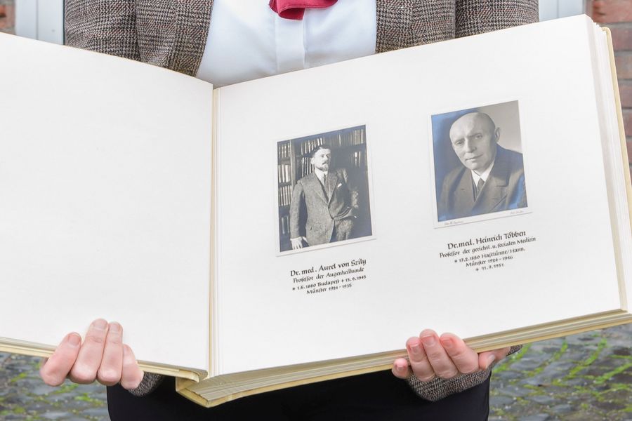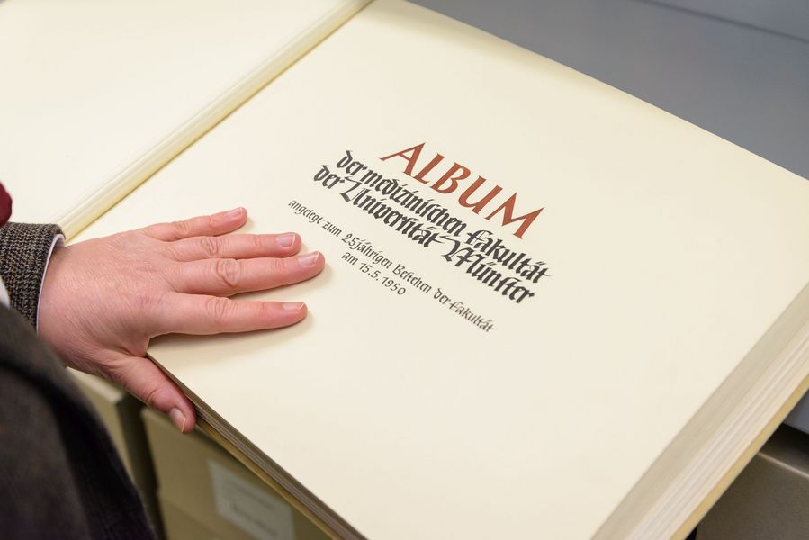 Die Geschichte des Fundstücks beginnt 1925: Erst nach mehreren vergeblichen Anläufen erhält die Universität Münster (WWU) in diesem Jahr eine Medizinische Fakultät und damit auch eine Uniklinik – der historische Gebäudebestand mit seinen Ziegelfassaden prägt noch heute die Domagkstraße. Nach Weltkrieg und Neuanfang kann die Fakultät im Mai 1950 ihr 25-jähriges Bestehen feiern – und gönnt sich aus diesem Anlass offenbar ein Fotoalbum mit den Porträts aller früheren und amtierenden Professoren. Der großformatige Band ist eine aufwändige Buchbinderarbeit, bezogen mit weißem Leinen und verziert mit metallenen Ornamenten, und liegt in einem passend gestalteten, schützenden Karton. Kein Zweifel: Diese Sonderanfertigung war schon bei Auslieferung etwas Exklusives.