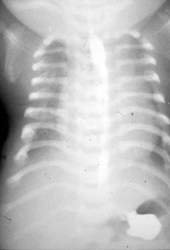 Die asphyxierende Thoraxdysplasie (Jeune-Syndrom) wurde 1954 erstmals von Jeune et al. beschrieben. Es handelt sich um ein autosomal-rezessiv vererbtes Fehlbildungssyndrom ausgelöst durch Fehlanlage des Chromosoms 15q13. Die Symptome bestehen in einem schmalen langen Thorax, kurzen Rippen, einer ausgeprägten Hypoplasie der Lunge mit schwerer Asphyxie (Abb. 1). Weitere Bestandteile sind ein Kleinwuchs, kurze Extremitäten sowie in vielen Fällen eine Niereninsuffizienz durch Nephronophthise, fibrozystische Veränderungen an Leber und Pankreas, eine Retinopathie sowie eine Hyperbilirubinämie. Die Mortalität ist bei Ausprägung aller Symptome sehr hoch. Als operative Verfahren sind die mediane Sternotomie mit Interposition einer Methylmethacrylat-prothese nach Todd sowie die laterale Thoraxexpansion nach Davis beschrieben.