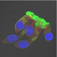 IF-Färbung von gesunden, respiratorischen Epithelzellen. Der Kern ist blau, das Tubulingerüst grün und der äußere Dyneinarm (ODA) rot gefärbt. Die gelbe Farbe zeigt die Überlagerung von grün und rot an.