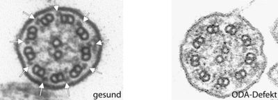 Im Zilienquerschnitt sind bei einem gesunden Probanden neun äußeren Doppeltubuli zu erkennen, denen äußere (Pfeile Bild links) und innere Dyneinarme ansitzen. Bei PCD-Patienten mit Mutation im DNAH5-Gen resultiert ein ODA-Defekt, d.h. der äußere Dyneinarm ist nicht vorhanden.