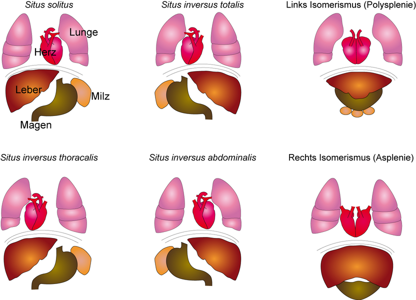 Abbildung 1: Schema der möglichen Situs Variationen. Beim Situs ambiguus werden vier Lateralitätsdefekte unterschieden: Situs inversus thoracalis, Situs inversus abdominalis, Links Isomerismus und Rechts Isomerismus. Beim Situs inversus thoracalis und Situs inversus abdominalis ist jeweils nur ein Teil der Organe im Situs gespiegelt angeordnet. Beim Situs inversus thoracalis sind das die Organe oberhalb, beim Situs inversus abdominalis unterhalb des Zwerchfells. Beim Links Isomerismus liegt die linke Situsseite verdoppelt vor, beim Rechts Isomerismus die rechte. Häufig ist jedoch eine Einteilung in diese vier Kategorien, aufgrund einer Kombination von Fehlbildungen, nicht möglich.