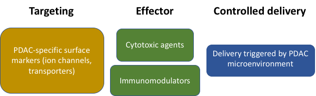The aim of the project is the generation of efficacious and convenient therapy agents using a multi-level strategy. Tumor cells will be eliminated by a combination of cytotoxic agents with immunomodulators aimed to compensate for the poor immunological response against PDAC. This aggressive approach requires a tightly controlled targeting and delivery to avoid undesired effects; specific targeting to the tumour will be achieved by directing the agent towards ion channels and transporters particularly enriched in the surface of tumour cells. Once the therapeutic agent is accumulated in the tumor, release of the active components will be triggered by the physico-chemical characteristics of the tumour microenvironment, in order to reduce the incidence of undesired effects.