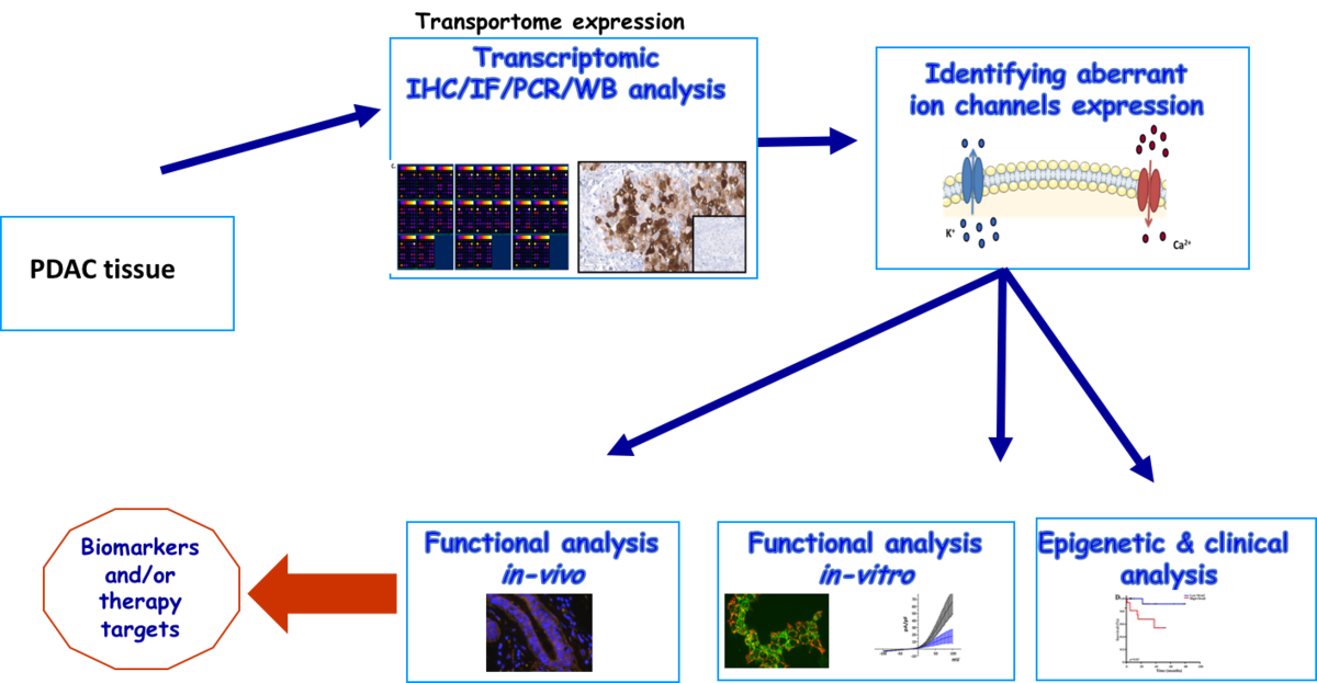In this project we will: (1) determine the expression profile of the pH-regulatory and-sensitive transportome (e.g. TRPM7, TRPC1, Kv10.1, KCa 3.1, K2P, Orai, NaHE1, PIEZO1….) in human PDAC tissues; (2) correlate their expression with clinical parameters (e.g. Ki67, staging, outcome, treatment, survival, relapse), (3) assess the epigenetic alterations (e.g. methylatin) of the genes coding these channels and transporters, and (4) analyse the in vitro and in vivo roles of selected transporters in PDAC and/or stroma cells, in association with their epigenetic dysregulation.