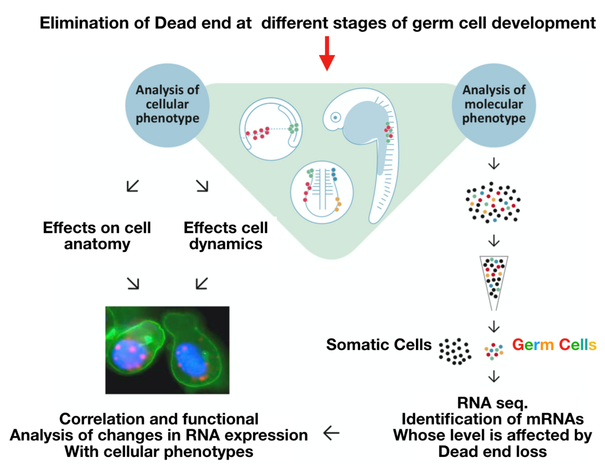 The Dead end protein plays a central role in controlling the fate of germline cells in all vertebrates, and its loss of function results in sterility and the teratoma formation. Within the CRU we have recently shown that in the absence of Dead end, zebrafish germ cells fail to follow their differentiation program and instead are transformed into cells of other lineages. To determine the precise role of Dead end at different stages of germ-cell development we will establish methods that allow knocking down Dead end at different time points. The consequences of such manipulations on the expression of RNA molecules and on germ-cell specific structures will be determined by RNA sequencing experiments and microscopy. Together, these results and studies derived from them in mouse and human will shed light on the molecular machinery controlling the development of the germline and gametogenesis in vertebrates.