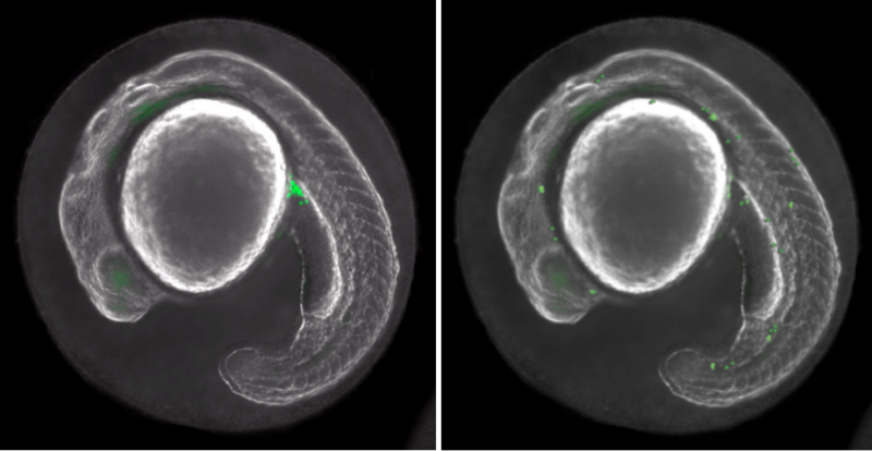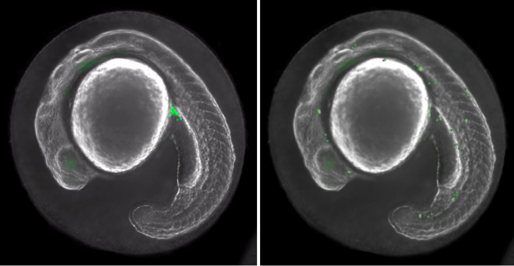 A live wild type zebrafish embryo with GFP-labelled germ cells at the region where the gonad develops (left) and an embryo in which the cells migrate and differentiate abnormally due to the lack of Dead end protein (right).