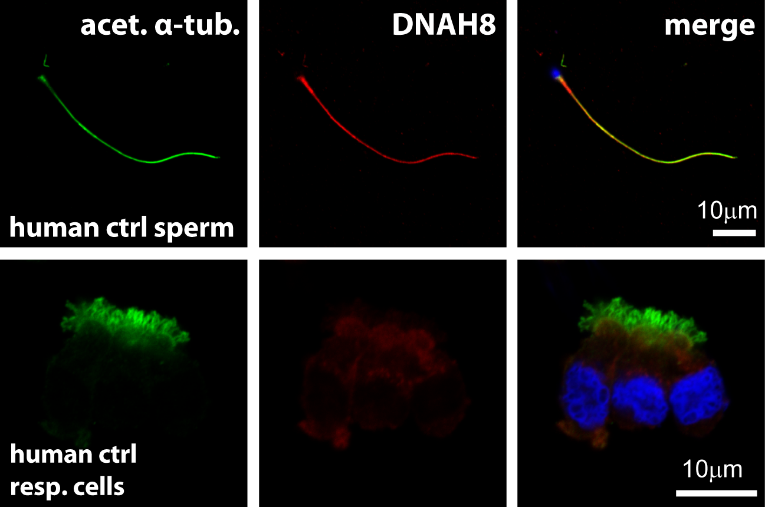 Sperm flagella contain a 9+2- microtubule structure that is also present in multiple motile cilia. Outer dynein arms (ODA), multimeric protein complexes with ATPase function, produce the flagellar and ciliary beat. Defects of the ODAs are associated with male infertility due to compromised sperm flagella motility (asthenozoospermia), but also a chronic destructive lung disease, due to defective respiratory cilia and mucociliary clearance. Our studies have shown that the composition of sperm flagella axonemes, especially ODAs, differ from motile cilia such as respiratory cilia. Within the CRU we identified novel genetic defects, e.g. C11orf70/CFAP300 and MNS1, resulting in ODA defects affecting male fertility. In addition, we found that ciliary beating of efferent duct cilia plays an important role for male fertility. To identify novel genetic defects and pathogenic mechanisms leading to male infertility due to ODA defects, we aim to further characterise ODA complexes in human sperm flagella and mouse efferent duct cilia.