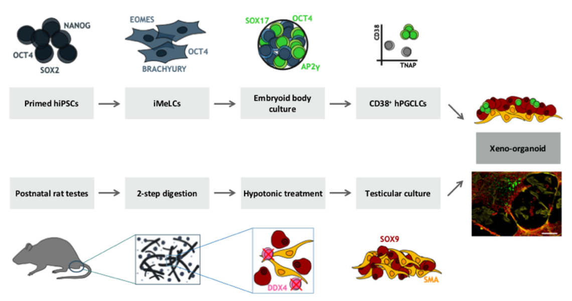 In the first funding period we established a xeno-organoid approach, consisting of reconstituted rat seminiferous tubule-like structures and co-cultured human PGCLCs. This enables us to describe crucial pathways involved in male somatic and germ cell specification. In this project we extend the experimental strategy. Xenografting of reconstituted testicular grafts and establishment of a homologous system (human primary testicular cells from adult transgender patients) opens fascinating scenarios for long-term and deep exploration of the influence of testicular microenvironments on fate decisions in human PGCLCs. Generation of human iPSC lines with loss-of-function (LoF) mutations in candidate genes via CRISPR/Cas will create options to correlate effects of gene knockouts on germline-somatic development. We expect that our findings help to identify pathways associated with impaired male fertility.