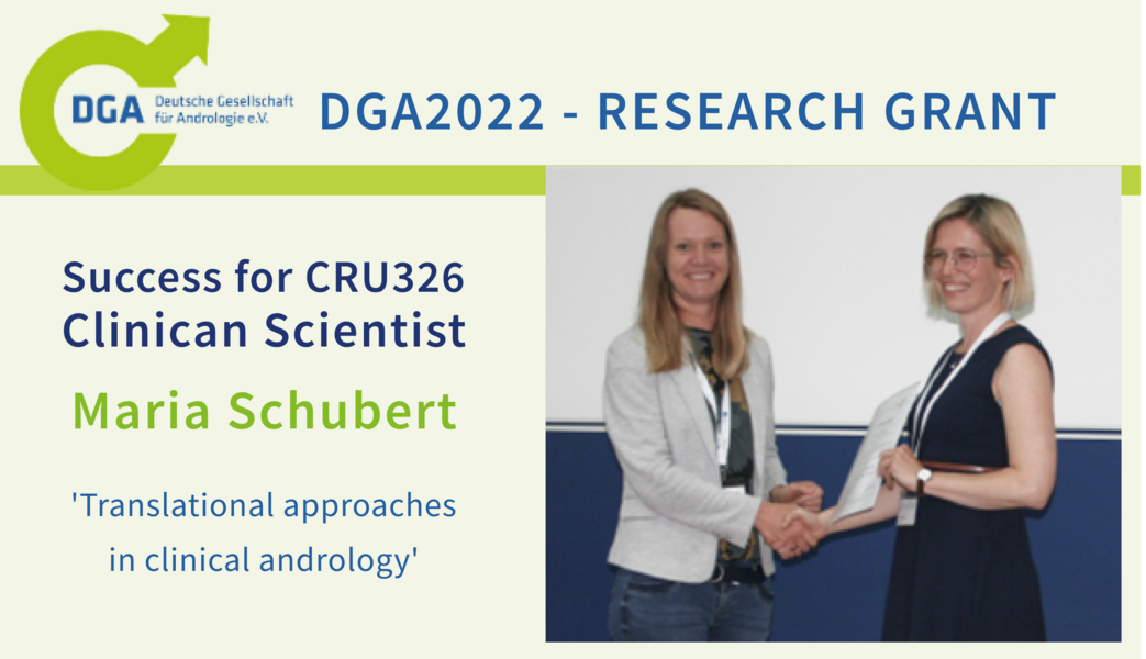 What a huge success for CRU326 member Maria Schubert: She was awarded this year's DGA ('Deutsche Gesellschaft für Andrologie') research grant and receives 10 000€ to conduct an own research project over the course of 12 months. Maria convinced the jury with a research proposal on 'Deciphering the uncommon phenotype of infertile men with azoospermia and 'normal' FSH serum level'.
