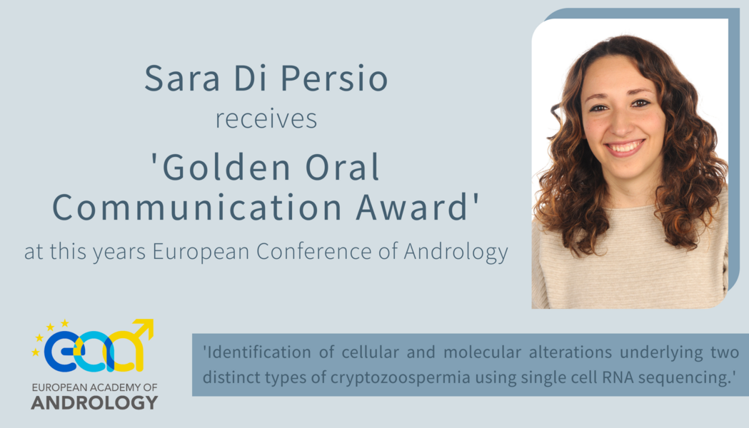 Congratulations to CRU member Sara di Persio for receiving this year’s ECA Golden Oral Communication Award. The award was presented during the 19th European Congress of Andrology (ECA), that took place from 19th-21st October in Barcelona. Sara convinced the jury with her presentation on “Identification of cellular and molecular alterations underlying two distinct types of cryptozoospermia using single cell RNA sequencing”. Her abstract was selected from over 150 accepted abstracts, four of which received the Golden Oral Communication Award. Along with the award, Sara received 500€ prize money and was granted the honour of presenting her talk in the main auditorium during the first plenary session.