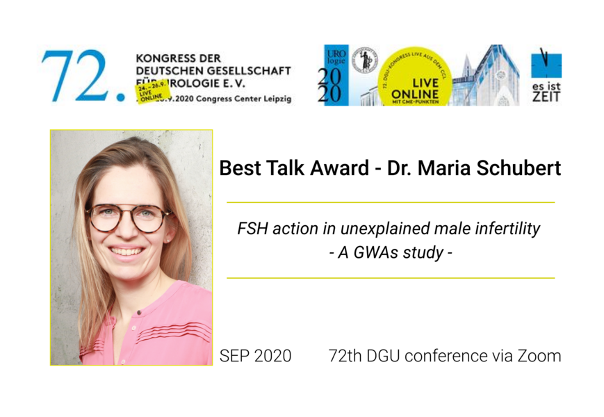 Our CRU326 colleague Dr. Maria Schubert was awarded at the 72nd Deutsche Gesellschaft für Urologie e.V. conference in Leipzig with the 'Best Talk Award' (category: experimental, 2nd place) for her talk entitled: 'FSH action in unexplained male infertility - a GWAs study'.