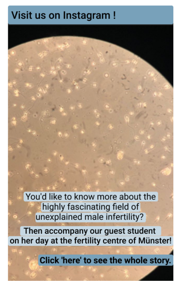 Melanie met different clinicans and scientists who brought near the highly relevant field of combining routine diagnostics and novel research to treat male infertility. During her stay, she captured interviews, characteristic techniques and general information about reproductive medicine for her Instagram feed.