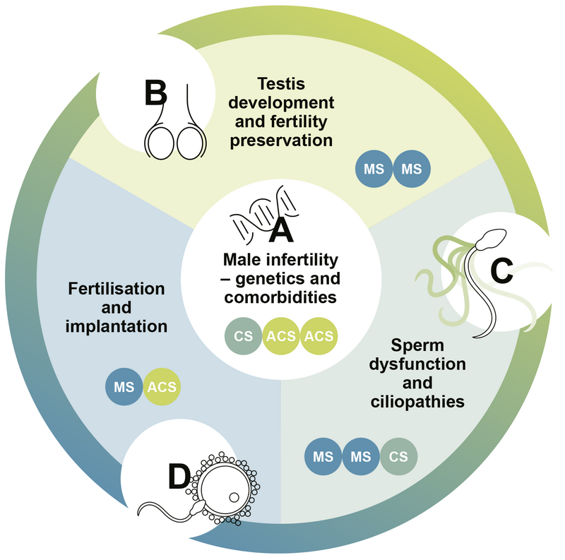 The programme spans a comprehensive spectrum from genetic causes of infertility and comorbidities (Research Area A), testis development and fertility preservation (Research Area B), over sperm dysfunction and ciliopathies (Research Area C), to fertilisation and implantation (Research Area D).