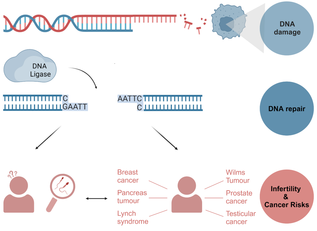 Infertility in men has been linked to increased morbidity, mortality, and a higher risk of developing cancers such as testicular, prostate, and melanoma. Genetic factors, particularly variants in DNA repair genes, are assumed to drive this association. DNA repair mechanisms are crucial both for maintaining genome stability and for enabling spermatogenesis, with disruptions potentially leading to both infertility and cancer. Genes like BRCA1/2, FANCM, and XRCC2 have been implicated in both cancer risk and non-obstructive azoospermia (NOA), highlighting shared molecular pathways. The project aims to explore this association by screening our Male Reproductive Genomics (MERGE) cohort of exomes/genomes from >2,700 infertile men and subsequent molecular analyses. In vitro assays will be established to assess individual variant’s functional relevance. Ultimately, the study seeks to understand the shared molecular mechanisms of male infertility and cancer, and to provide better counselling and care for affected men.