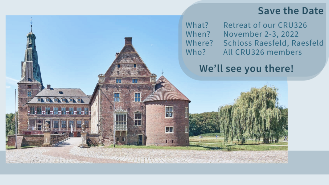 After a seemingly never ending time of virtual meetings and social distancing we are very much looking forward to catching up in person again at the wonderful location of Schloss Raesfeld. During the scientific retreat we shall discuss scientific advancements and project developments. We further hope to foster collaboration and interaction between CRU projects.