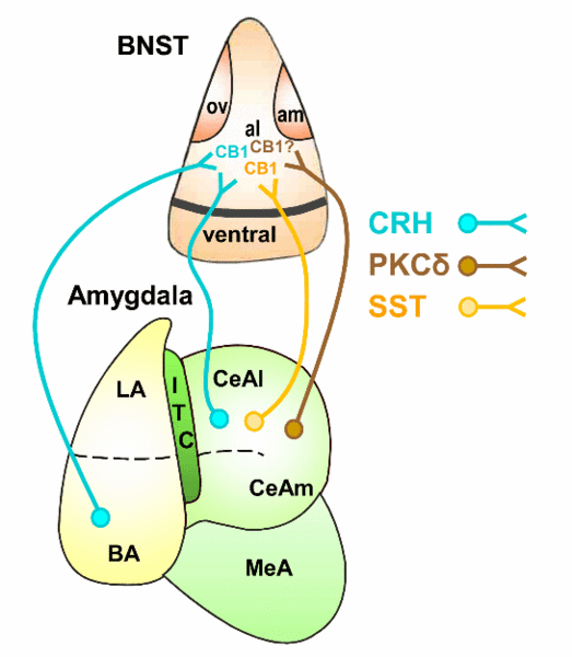 Project A04 aims at identifying the cell-type specific involvement of endocannabinoid signaling in the different neuronal projections from the amygdala to the bed nucleus of the stria terminalis (BNST) regarding the regulation of the individual fear response profile. Cannabinoid CB1 receptor function will be inactivated specifically in three amygdalar neuronal subpopulations, expressing expressing corticotropin releasing hormone (CRH), protein kinase Cδ (PKCδ), or somatostatin (SST).
