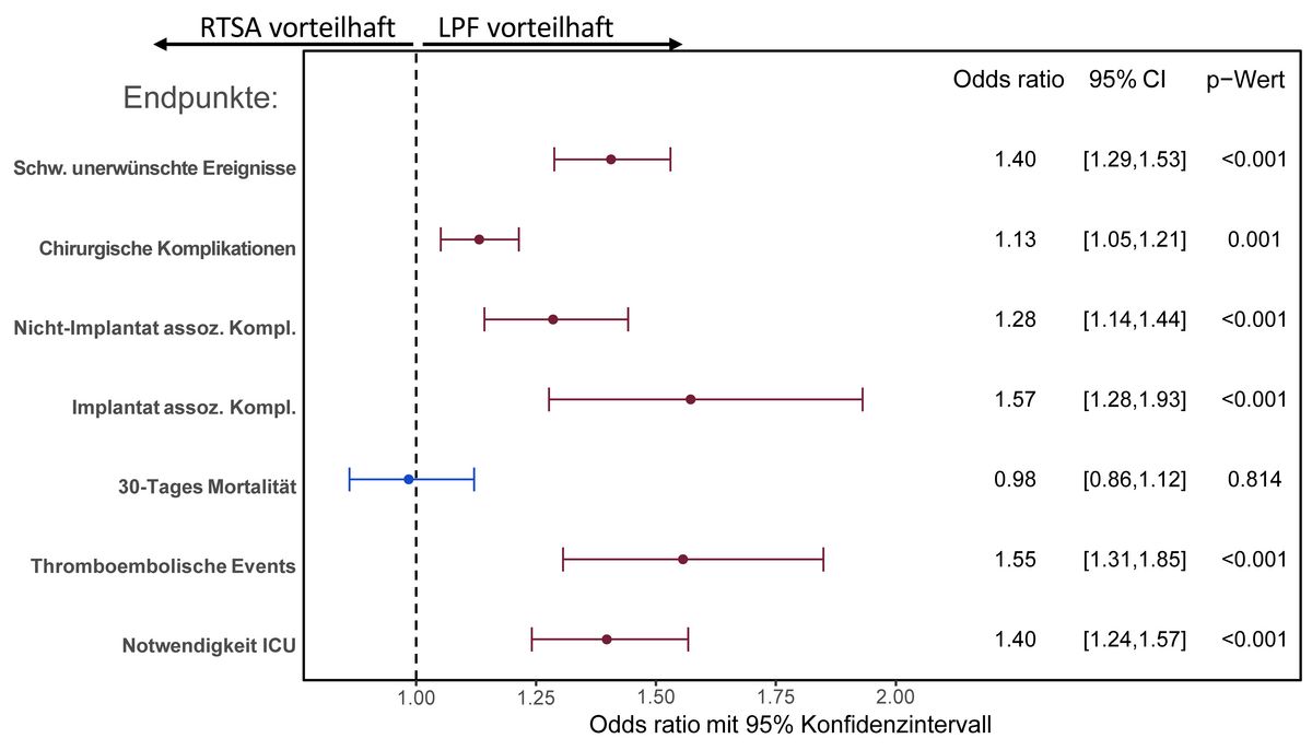 Auf Grundlage bundesweiter Abrechnungsdaten aller AOK-Versicherungen haben wir das Outcome von Patient*innen ab 65 Jahren mit proximaler Humerusfraktur untersucht, die entweder mit winkelstabiler Plattenosteosynthese (LPF) oder mit totaler inverser Schulterendoprothese (RTSA) behandelt wurden. Insgesamt haben wir mehr als 55.000 Patient*innen in die Studie aufnehmen können.