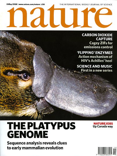 | 37. | Warren WC, Hillier LW, Graves JAM, Birney E, Ponting CP, Grutzner F, Belov K, Miller W, Clarke L, Chinwalla AT, Yang S-P, Heager A, Clarke D, Miethke P, Waters P, Veyrunes F, Fulton L, Graves T, Puente X, Lopez-Otin C, Ordonez GR, Eichler EE, Deakin JE, Thompson K, Kirby P, Papenfuss AT, Wakefield M, Olender T, Lancet D, Huttley GA, Smit AFA, Renfree M, Temple-Smith P, Batzer MA, Jerilyn A, Walker JA, Konkel MK, Harris RS, Taylor J, Whittington CM, Gemmell N, Buschiazzo E, Jentzsch IV, Merkel A, Schmitz J, Zemann A, Churakov G, Kriegs JO, Brosius J, Murchison E, Sachidanandam R, Smith C, Stark A, Hannon G, Rens W, Ferguson-Smith M, Lefevre C, Sharp J, Nicholas KR, Ray D, Kube M, Reinhardt R, Pringle TH, Flicek P, Washington University Genome Sequencing Center, Mardis ER, Wilson RK | Genome analysis of the platypus reveals unique signatures of evolution | Nature 453:175-184, 2008 | Cover | |