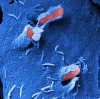 In humane Epithelzellen einwandernde Darmbakterien der Spezies Y. pseudotuberculosis.