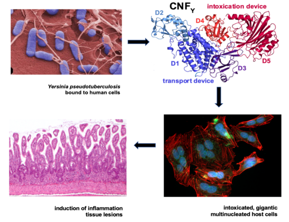 Secretion and translocation of the CNFY toxin by Y. pseudotuberculosis with the leads to massive actin cytoskeletal rearrangements, giant multinucleated cells and triggers strong inflammation of the intestinal epithelium.
