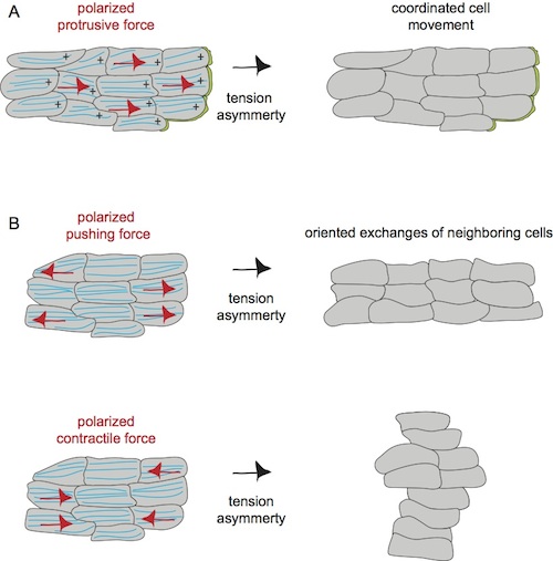 Tissue morphogenesis often requires collective cell behaviour. Only the integration of locally produced forces into a global tissue force pattern determines the resulting changes in cell and tissue shape. One of the principal signalling pathways coordinating individual cell dynamics to generate large tissue-scale rearrangements during morphogenesis is planar cell polarity (PCP). We recently showed that PCP signalling pathway is capable of globally patterning MT cytoskeleton during epithelium development to coordinate local cell behaviours. Furthermore, we demonstrated that MT plus ends are stabilized at specific AJs in PCP dependent manner (Video 3), which allows MTs to continue polymerizing thereby generating - similar to actin - pushing forces in a coordinated polarized fashion (i.e. compressive forces). These studies suggest that apical non-centrosomal MTs nucleated at cellular interfaces contribute to epithelial tissue morphogenesis via coordinated generation and integration of local, cell-based forces into a global tissue force pattern (collective mechanics).